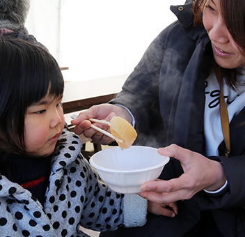 湯気がたつ「厄除け大根」を食べる親子連れ