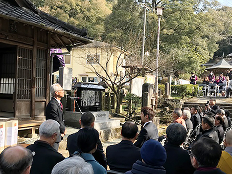 義士遺髪塔がある熊本県山鹿市の日輪寺で行われた堀内伝右衛門顕彰碑の除幕式=満重義浩さん提供