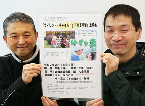 上映会への来場を呼び掛ける赤穂ろうあ協会の木下一則会長(左)と霜田直宏事務局長