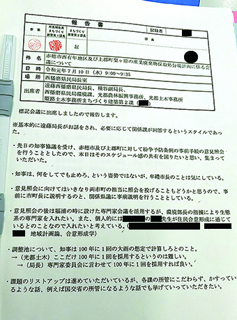 問題の文書は、昨年7月10日に遠藤局長と副局長、関係法令を所管する各部署の担当者が集まって開いた関係部署会議の「報告書」。会議に出席した姫路土木事務所の担当課長が協議の主な内容をA4判1枚にまとめたものだ。作成日の記載はないが、7月17日に担当課長と面談した市民団体がこの文書を確認しているため、会議から1週間以内に作成されたとみてよい。