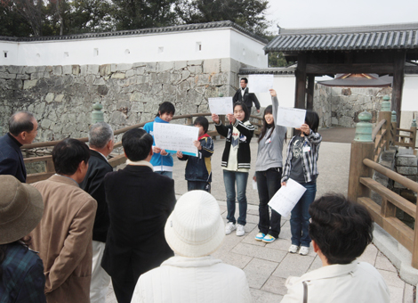 赤穂城跡、息継ぎ井戸、花岳寺など6カ所で観光客を待ち受け、その場所にまつわる歴史やエピソードを紹介。「赤穂城は昔、何と呼ばれていたでしょう」「大石邸の畳の枚数は」など、自分たちで考えたクイズも出題し、観光客から好評を得た。