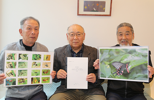 ジャコウアゲハの生態観察について第3報となる調査報告書をまとめた=左から=尼子公一さん、木村繁之さん、山下一之さん