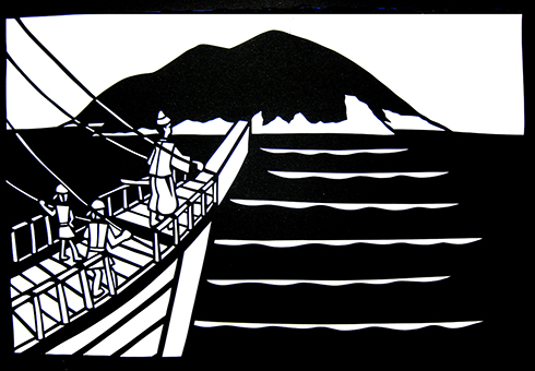 一行は大阪を船出し、島々をまわり、西へ西へとやって来ました。そして、鹿久居島を見つけ、部下に命じて調べさせました。