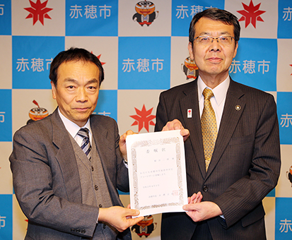 赤穂市児童虐待対応アドバイザーに委嘱された頓田二朗さん(左)