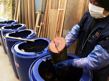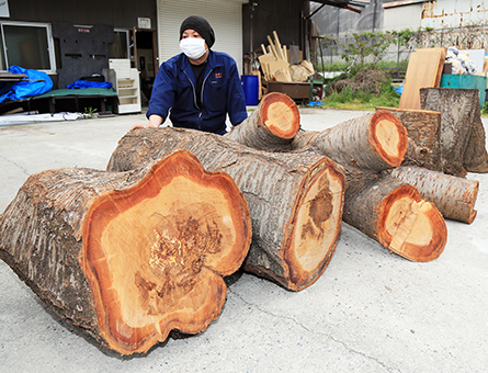 それに待ったをかけたのが市内で木工会社「一嘉彩工(ひとかさいこう)」を営む茶谷誠さん(42)=御崎=。知人を通じて「この桜を連れて帰らないか」と声を掛けられ、「尾崎の地に根付き、慣れ親しまれた桜が処分されてしまうのは惜しい」と引き取りに手を上げた。伐採業者が切断した幹や枝を軽トラックで3回に分けて大津の作業場へ運搬。木材に一旦水を吸わせてから乾かす「水中乾燥」を施すため、水を張ったプラスチック樽や中古のバスタブに投入した。最も太い根元の部分は木枠とブルーシートで組み立てた自作の水槽に浸した。