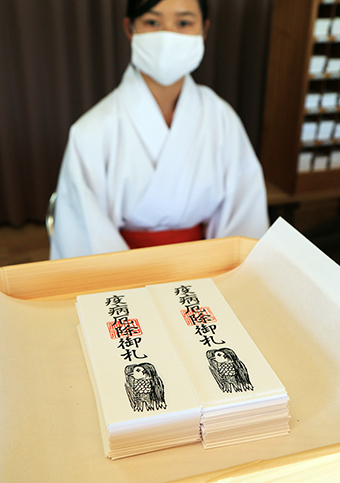 飯尾義明宮司は「参拝された方からの要望もあり奉製しました。御札がみなさんを元気付け、感染予防へ気持ちを新たにすることに役立てば」と話している。