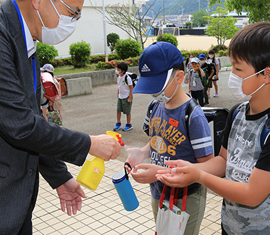 赤穂小学校(415人)では午前7時40分から児童玄関前で教職員4〜5人が登校してきた児童らを出迎えた。児童たちはお互いになるべく距離を開け、一人ずつ順番に先生から消毒用アルコールのスプレーを手にふきかけてもらい、手指消毒してから校舎へ入った。登校前に計った児童の体温を保護者からメールなどで受け取り、自宅で検温できなかった児童は学校で測定。少なくとも1か月間は、こうした取り組みを続けるという。