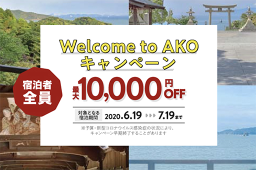 県の休業要請でゴールデンウイークを含む長期休業を余儀なくされ、深刻な経済的被害を受けた宿泊施設の支援を目的に赤穂観光協会が実施する。6月19日(金)から7月19日(日)までの間、キャンペーン参加の旅館やホテルに宿泊すれば、料金に応じて宿泊者1人につき1000円〜1万円を割り引く(日帰り利用は対象外)。15日から各宿泊施設で予約を受け付け、割り引き総額が1500万円に達した時点で終了となる。赤穂市が国の地方創生臨時交付金を活用して事業費全額を補助する。