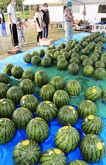 例年は一日限定の直売会「大津スイカまつり」でにぎわうが、新型コロナ対策が求められる今年は混雑を避けるために4回に分けて販売することに。初回となった12日には約150玉を出品し、テントの下にサイズ別にズラリと並べられたスイカの中から客が品定めして購入した。