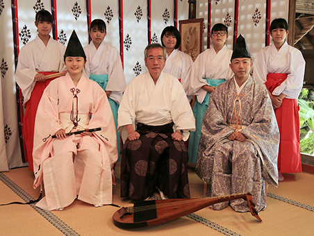 衣装を着けた部員らは緊張した面持ちで拝殿へ上がり、3年生の浜本実季さん(17)の龍笛に合わせて1年生5人が謡いを披露。南都楽所(なんとがくそ)の楽師でもある永井信行顧問が琵琶の音色を重ねた。感染予防対策として拝殿の引き戸を開放していたこともあり、境内全体に演奏が聞こえた。