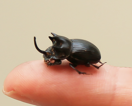 人の指先に乗るほどの大きさのゴホンダイコクコガネ。5つの突起が特徴。メスは小さな角が一つある