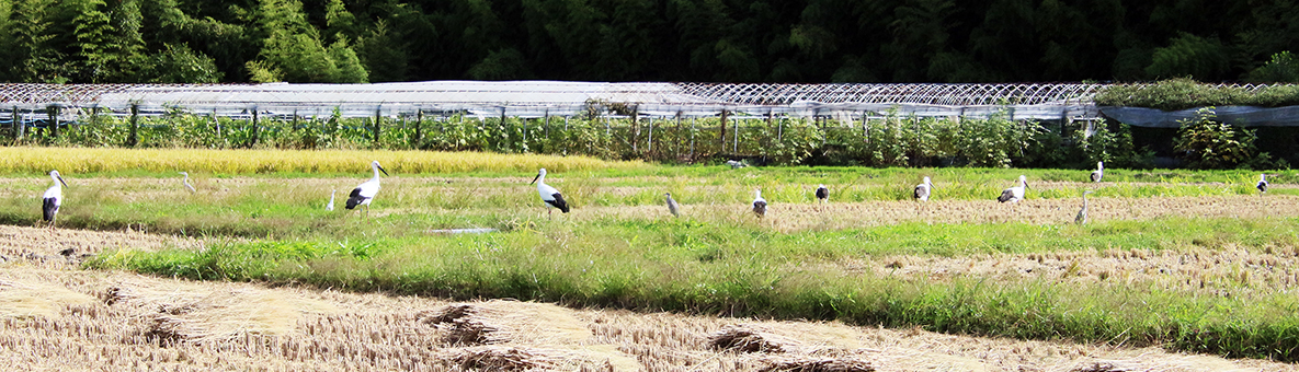 近所の人の話によると、午前8時40分ごろ、収穫が終わった水田に複数のコウノトリが降り立っているのを見つけた。数えると、その数10羽。さらに、サギとみられる2〜3羽も加わり、あぜや地面をくちばしでつついて餌を探していたという。