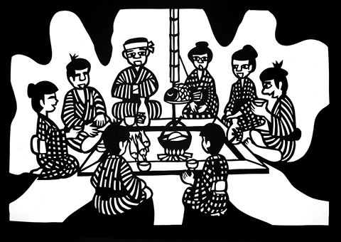 きょうは吾助はんの家の当番です。夕食がすむと、大人も、子供も集まって来ます。世間話が何よりの楽しみで、子供には子供の話をしてやります。