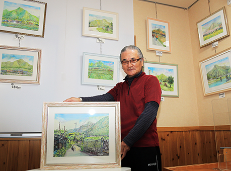 尼子山を描いた水彩画展を開いている徳丸透さん