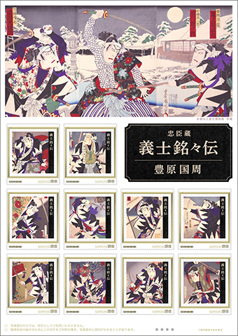 同社が2008年から毎年発売している忠臣蔵フレーム切手の第13弾。役者絵で人気を集めた明治期の絵師、豊原国周(1835−1900)が描いた大判錦絵「義士銘々伝」から九代目市川團十郎演じる原惣右衛門、五代目尾上菊五郎演じる富森助右衛門などを絵柄に活用した。