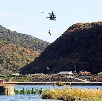 増水した千種川に漁師2人が流されて行方不明になっている、との想定で赤穂警察署を含む32人が参加した。ゴムボートで川岸沿いを捜索したほか、ドローンで上空からも探索。要救助者が中州に取り残されているのを発見し、航空隊のヘリコプターからロープ降下した隊員が吊り上げて救出した。