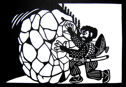 いつの頃からか、その岩を、「弁慶のとめ岩」というようになり、今でも、大きい岩が、そのまま残っています。(赤穂市教育委員会刊『赤穂の昔話 第二集』・「弁慶のとめ岩」より)=切り絵・村杉創夢