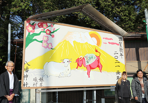 絵馬の大きさは縦約1・8メートル、横約3・7メートル。赤い雄牛と白い雌牛を中央に配し、梅の花と富士が描かれている。今回初めて設置した。