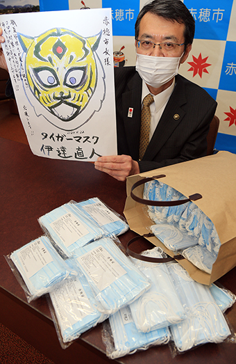 ▼不足のマスクや消毒水など寄贈相次ぐ=新型コロナウイルスの感染拡大防止に役立ててほしいと、複数の企業や個人からマスクなどの善意の寄贈が赤穂市に相次いだ。