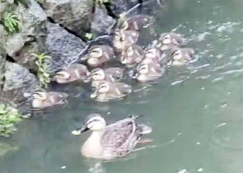 ▼用水路にカルガモの大家族=山手町の「戸島用水」にカルガモの親子13羽。かわいい姿が話題に。