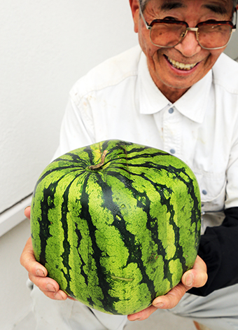 ▼赤穂の新特産に!? 四角いスイカ=ご当地フルーツ「大津スイカ」の栽培で知られるベテラン農家グループ「大津年輪の会」(旧林茂存会長)が、型枠を使って成形した四角いスイカの試作に成功。