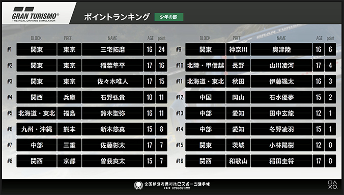 全国都道府県対抗eスポーツ選手権2020「グランツーリスモSPORT」少年の部の初日ポイントランキング