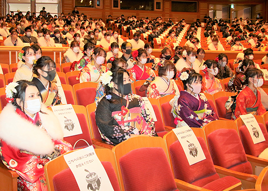 対象となった2000年度生まれの498人のうち402人が出席した。全員にマスクの着用と入場時の検温を義務付け、座席を一つずつ空けて密を回避。保護者の参加を取り止めるなど感染防止に努めた。