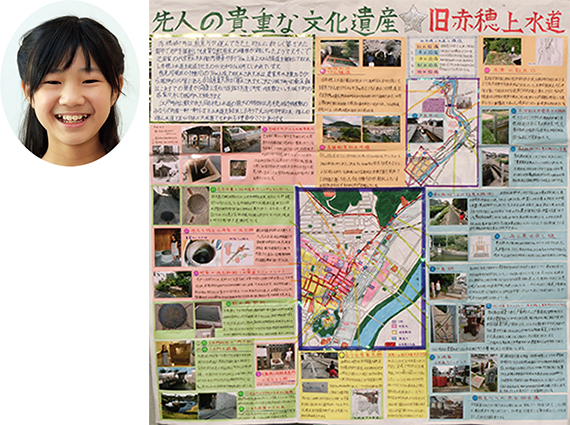 全国児童生徒地図優秀作品展で文部科学大臣賞を受賞した畑中彩希さんと受賞作「先人の貴重な文化遺産 旧赤穂上水道」