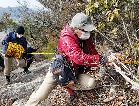 感染症対策のため全員マスクをつけたまま作業。息苦しさを我慢しながら約3時間かけて用意した200メートル分のロープをすべて張り終えた。「みなさんの頑張りのおかげで、とても登りやすくなった」と橋本さん。今月中には何合目かを示す標柱を老朽化した木製からアルミ製に更新し、来年度は別の登山口に標識を設置するなど引き続き整備を続ける計画という。
