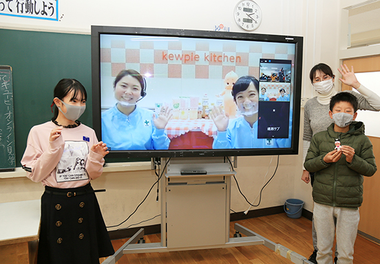 コロナ禍で校外学習が困難な中、昨年10月からオンラインの工場見学を受け入れている同社の協力で実施した。テレビ会議システムを使って神戸市東灘区にある神戸工場から広報CSVチームの坂東香奈さん、塩見彩さんが主力商品のマヨネーズを一日50万本出荷する製造ラインを紹介した。