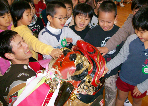 「大きな口やー」などと言いながら獅子とふれあう園児たち