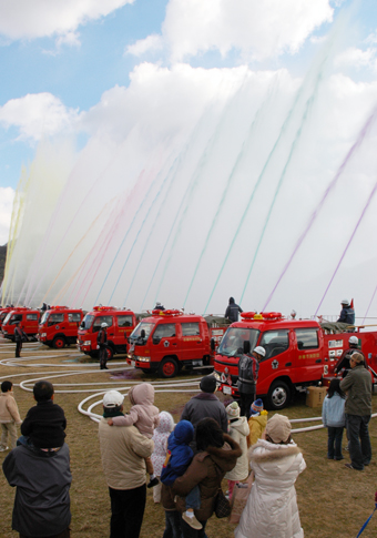 8色の一斉放水で火災のない一年を願った市消防出初式