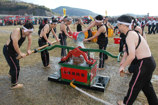 分団対抗の放水合戦では上半身裸や、今年の干支にちなんでウシのコスプレ姿の団員も見られ、会場の笑いを誘った。