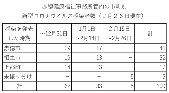 公表された人数によると、赤穂健康福祉事務所管内の累計感染者数は100人で、前回集計時の83人から17人増えた。このうち、2月14日までに感染確認が発表された95人について居住市町別に振り分けた人数が公表され、相生市32人(前回集計比13人増)、上郡町17人(同3人増)となった。2月15日以降に感染が発表された5人については「赤穂健康福祉事務所管内」とした。
