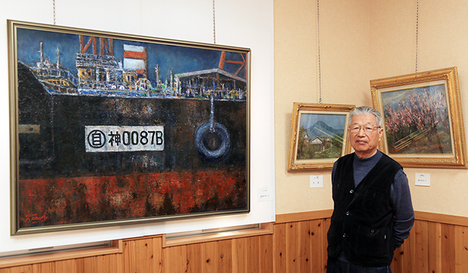 絵画をライフワークとする田中さんは、これまでに赤穂市美術展で市長賞を2度受賞。今展では「旅の思い出」をテーマに、青森の十和田湖や牛窓のオリーブ園などを描いた風景画を中心に6〜60号の10点を展示している。