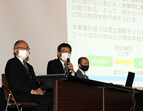 この日は、遮水シートの劣化や浸出水の環境影響、ダイオキシンや放射能汚染物質が持ち込まれる心配など、主催者側で設定した8つの懸念事項に事業者側が回答。「遮水シートのメーカーからは80年以上の耐用年数を想定できるとの結果を得ている」「事業計画事前協議書には記載していないが、脱塩処理設備を導入する考え」「埋立基準を満足する廃棄物の埋め立てであれば、周辺住民や作業員の安全は確保される」などと説明した。