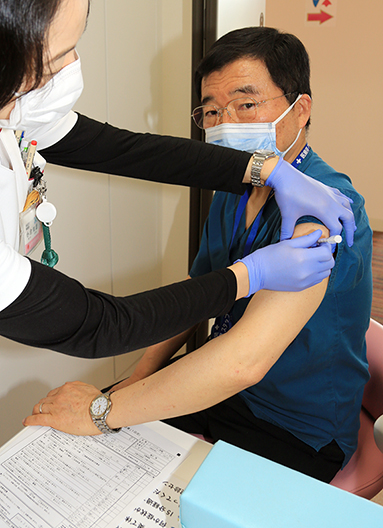 病院によると、職員(委託業者を含む)の8割を超える約700人が優先接種を希望。この日は新館4階の健診センターを中心に藤井隆院長をはじめ140人が接種を受けた。副反応が生じた場合を想定して応急処置の救急カートを配備するなど万全を期した。