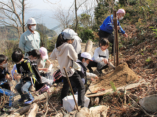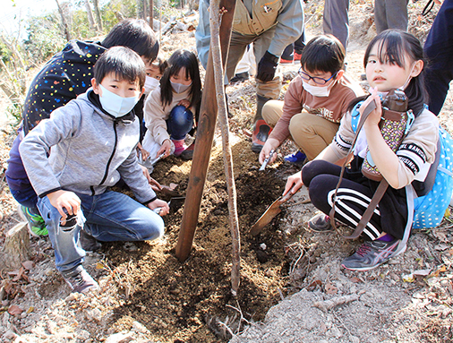 同クラブは2007年以降、唐船山や東御崎展望台など市内各所で植樹活動を実施。この日は会員約20人と坂越小3年生約30人、地元まちづくりグループ「さこし船岡を良くする会」の6人で山頂付近に桜の若木16本を植え付けた。