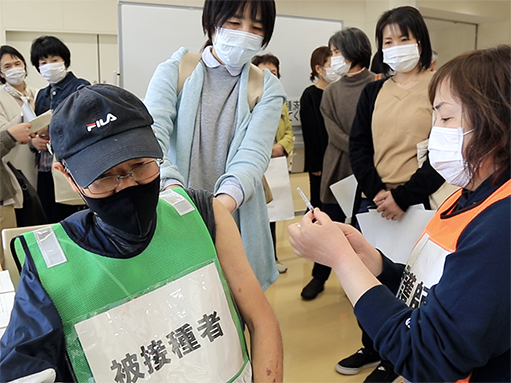 この日の訓練は問診から接種のラインを2本設け、被接種者役53人が経過観察を終えるまでに約1時間半を要した。市は今のところ、「2時間で100人」に接種する計画を立てており、「受付で人が滞留した。きょうの訓練を踏まえて人員配置や接種体制を改善していきたい」(新型コロナウイルスワクチン接種対策室)と話した。