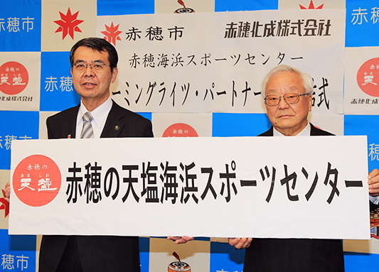 市との調印式で池上良成社長は「海浜スポーツセンターがある一帯は我々にとって『聖地』。これからも市と連携して『塩のまち赤穂』を盛り上げていきたい」と抱負を語った。