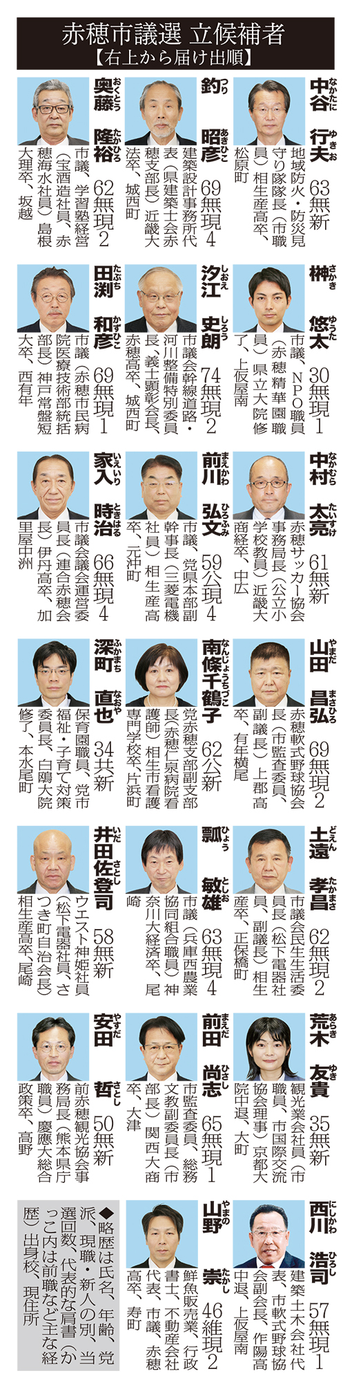 =市議、学習塾経営(宝酒造社員、赤穂海水社員)島根大理卒、坂越