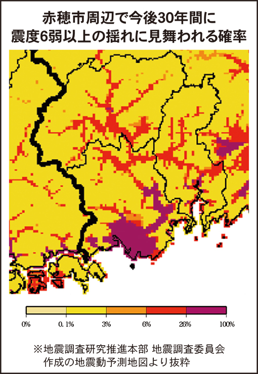 国立研究開発法人防災科学技術研究所のホームページ「地震ハザードステーション」では各地点の確率を表示できる。赤穂市役所がある地点では、今後30年間で震度6弱以上の揺れに見舞われる確率は38・5%、震度6強以上は6・0%となった。2008年版の同じ地点の確率は震度6弱以上7・5%、震度6強以上0・2%で、確率の上昇が伺える。また、千種川沿いでは震度6弱以上が50%超、震度6強以上は10%超の地点も見られた。