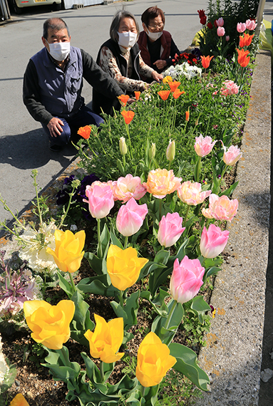 年に2回、市から提供されるパンジーなどのほか、住民らがホームセンターなどで購入した種子や球根を植え替え、草抜きや水やりの世話をする。日々のごみ出しの度に咲き具合を見ることが、ささやかな喜びになっているという。