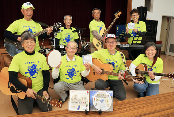 「ぼくらおさきキャラクター〜尾崎の歴史を伝えるために〜」、「尾崎の頭人Yaiyeh!」の地元ソングのほか、北前船寄港地として栄えた坂越を歌った「この町から〜北前船に想いを馳せて〜」、巨岩を地域の名所にしようとする取り組みを盛り上げる「ふっくら福浦ビシャゴ岩音頭」など、尾崎地区以外のまちおこしへエールを送る曲も収録。作詞作曲を手掛けたボーカルの江端恭臣さん(60)=尾崎=は「そこに住んでいる人たちが地元を好きになれば、きっと良いまちになっていく、と願いを込めました」と楽曲への思いを語った。