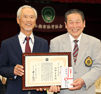 兵庫県体育協会からマスターズ賞の表彰を受けた池田正男さん(右)