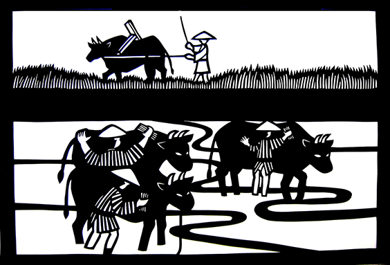 それからというもの、その田んぼは、田植えに入ることができない底なしの泥田になってしまいました。有年に伝わるお話です。(赤穂市教育委員会刊『赤穂の昔話』・「節句のたんぼすき」より)=切り絵・村杉創夢
