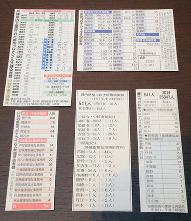 いずれの新聞社も兵庫県と市町の発表を集計した人数を掲載しているのですが、振り分ける基準によって数字が変わります。新規感染者数、累計、前日比など、掲載されている項目も新聞社によって少しずつ異なります。