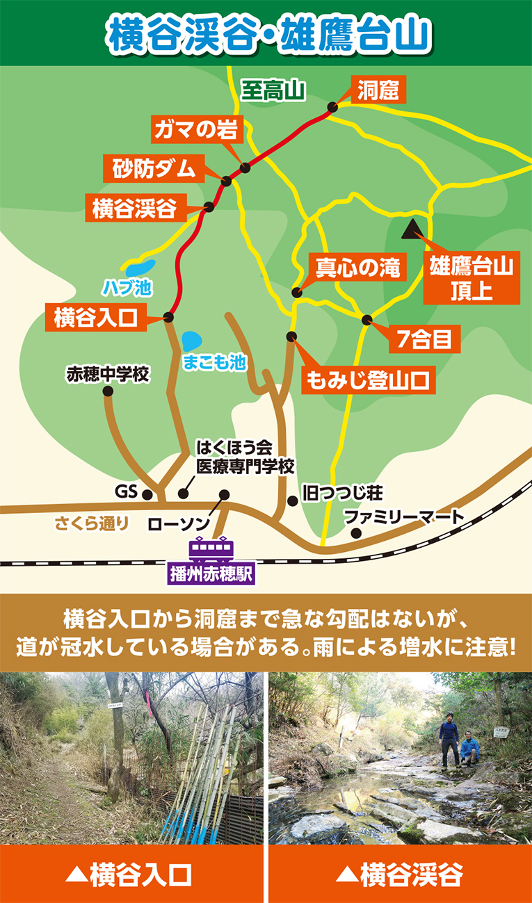 ほぼ平坦な山道を450メートルほど歩くと横谷渓谷。砂防ダムを越えた水が岩場を流れる。せせらぎを横に聞きながら先へ進むと、形がカエルに見える「ガマの岩」、かつて鉱物を採掘しようとした跡といわれる洞窟がある。洞窟までは途中の分岐から雄鷹台山、高山、塩屋のハブ池へ至るルートもあり、バリエーションのある山歩きが楽しめる。