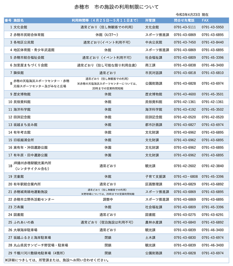 緊急事態措置に伴う赤穂市立施設の利用制限=赤穂市の発表資料を引用