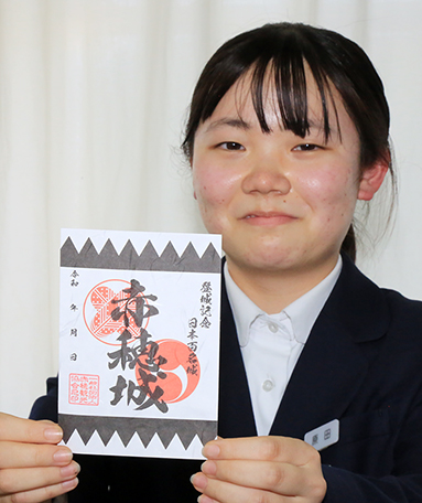 新たに発行された赤穂城の御城印に作品が採用された赤穂高校書道部の原田侑奈さん
